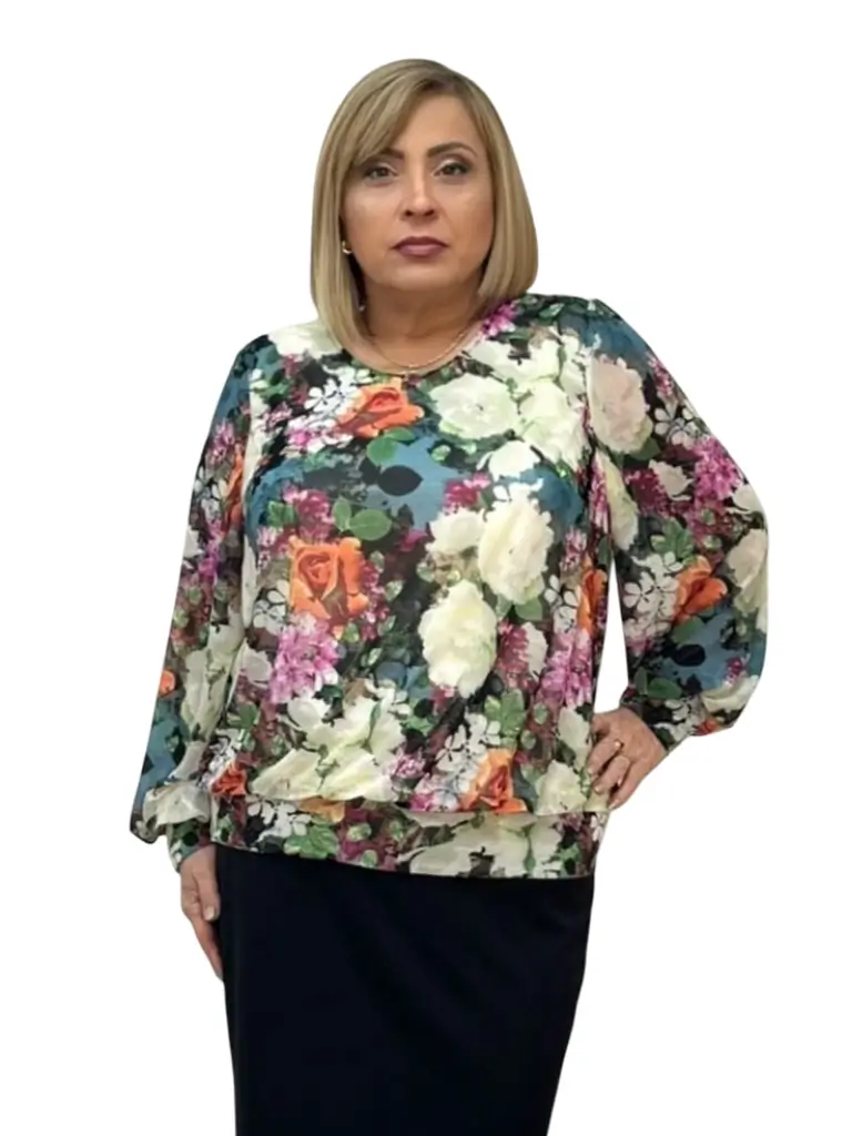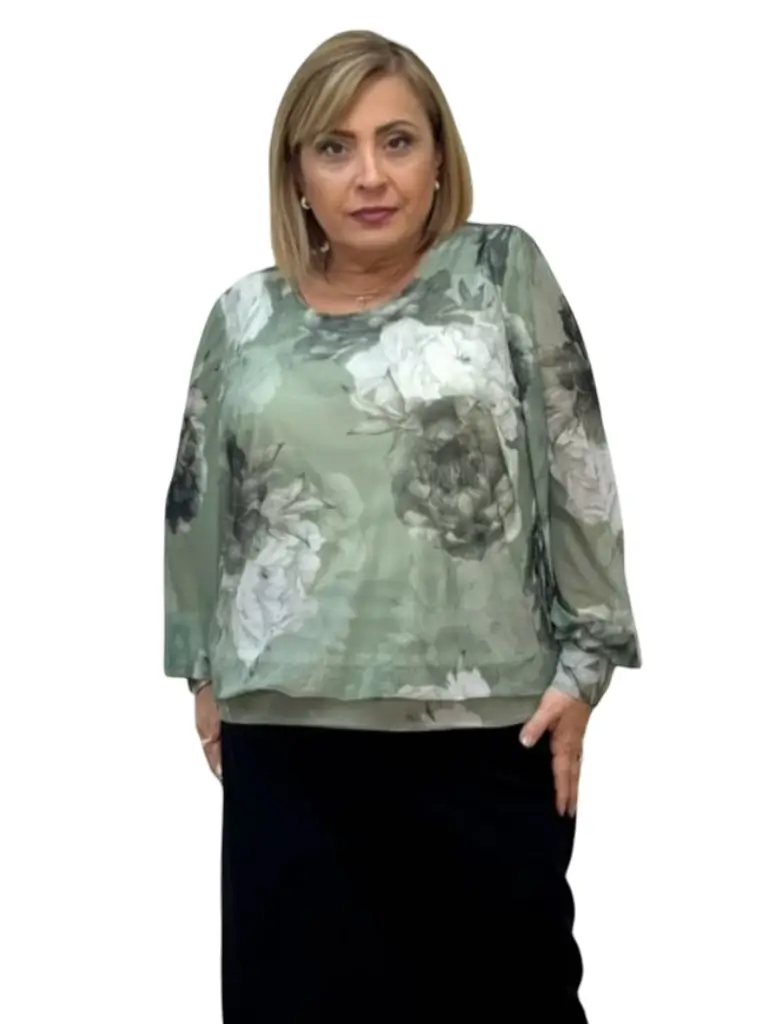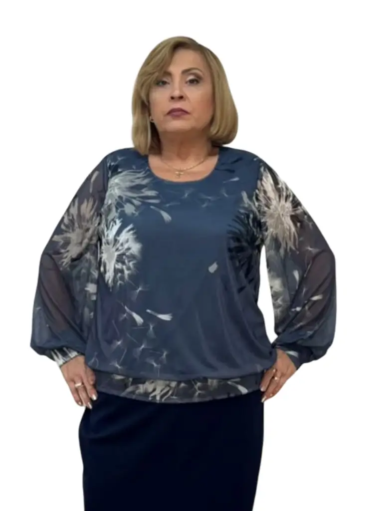 Bluza Gabi este realizată din tull elastic imprimat, dublată pentru un plus de confort și eleganță. Materialul moale și plăcut la atingere se mulează ușor pe forme, oferind libertate de mișcare și o senzație delicată pe piele. Banda aplicată pe șolduri conturează frumos linia corpului și ajută bluza să se așeze perfect, avantajând toate tipurile de siluetă, inclusiv mărimile mari. Este o piesă versatilă, ideală atât pentru ținute de zi, cât și pentru ocazii mai speciale, adăugând un strop de feminitate și rafinament fiecărui look. Bluza Gabi îmbină naturalețea cu eleganța simplă.
