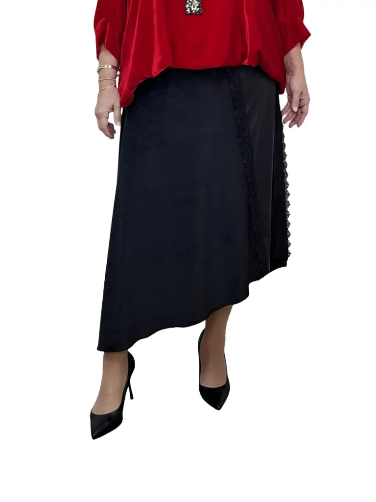 Fusta CAMELIA este o piesă statement, creată dintr-un mix rafinat de catifea și piele, completată de o garnitură delicată din dantelă care adaugă feminitate și eleganță. Texturile contrastante se îmbină armonios, oferind un look modern și sofisticat, iar croiul asimetric conferă dinamism și un plus de originalitate. Catifeaua moale se așază frumos pe siluetă, în timp ce detaliile din piele subliniază linia corpului într-un mod îndrăzneț, dar rafinat. Este o fustă versatilă, potrivită atât pentru ținute elegante de seară, cât și pentru outfituri fashion de zi. Fusta CAMELIA redefinește feminitatea prin stil și expresivitate.